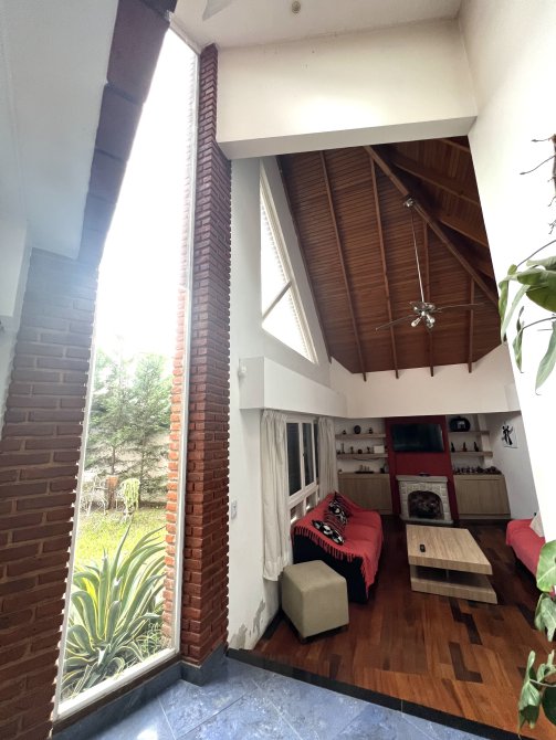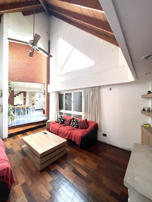 Un Toilette, un comedor con gran ventanal y salida al patio y jardín. El living con pisos de madera en desnivel tiene vista al frente y al jardin, un hogar a gas, y techos en doble altura.
