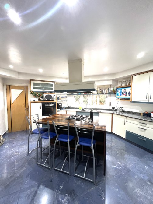 En planta baja cuenta con una cocina con isla, que se comunica con un lavadero y tiene acceso desde la cochera, con vista y salida al jardín.